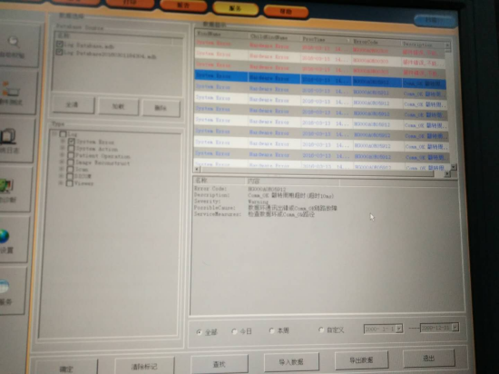 (2)機(jī)架通訊故障,可以通過軟件故障查看器將故障鎖定,在通過檢查硬件將其確定。如此醫(yī)院:先將機(jī)架打開,看到COMM上面指示燈不跑馬,可以基本確定是光路出現(xiàn)故障,再通過軟件提示和硬件測(cè)試將故障排除。